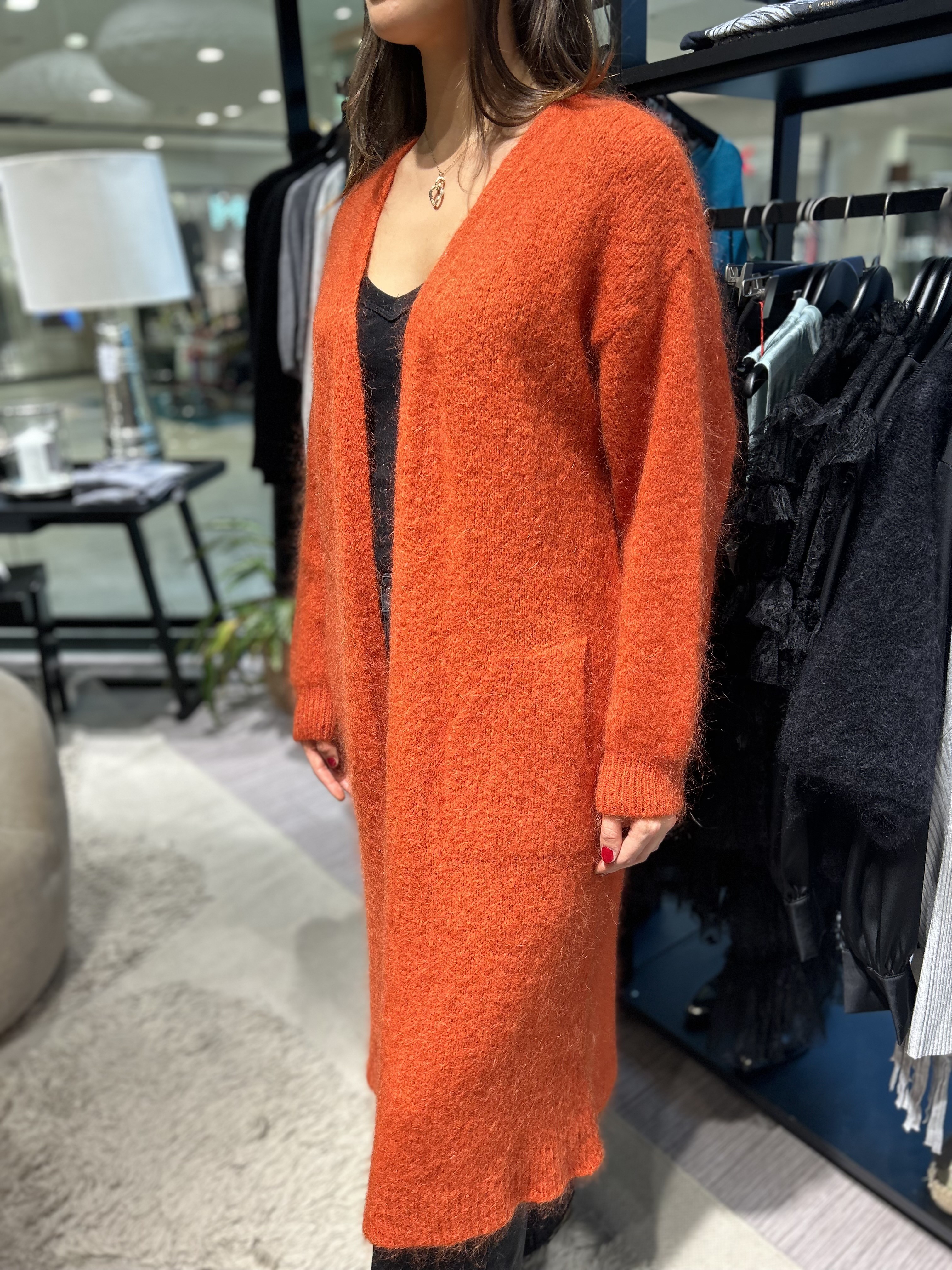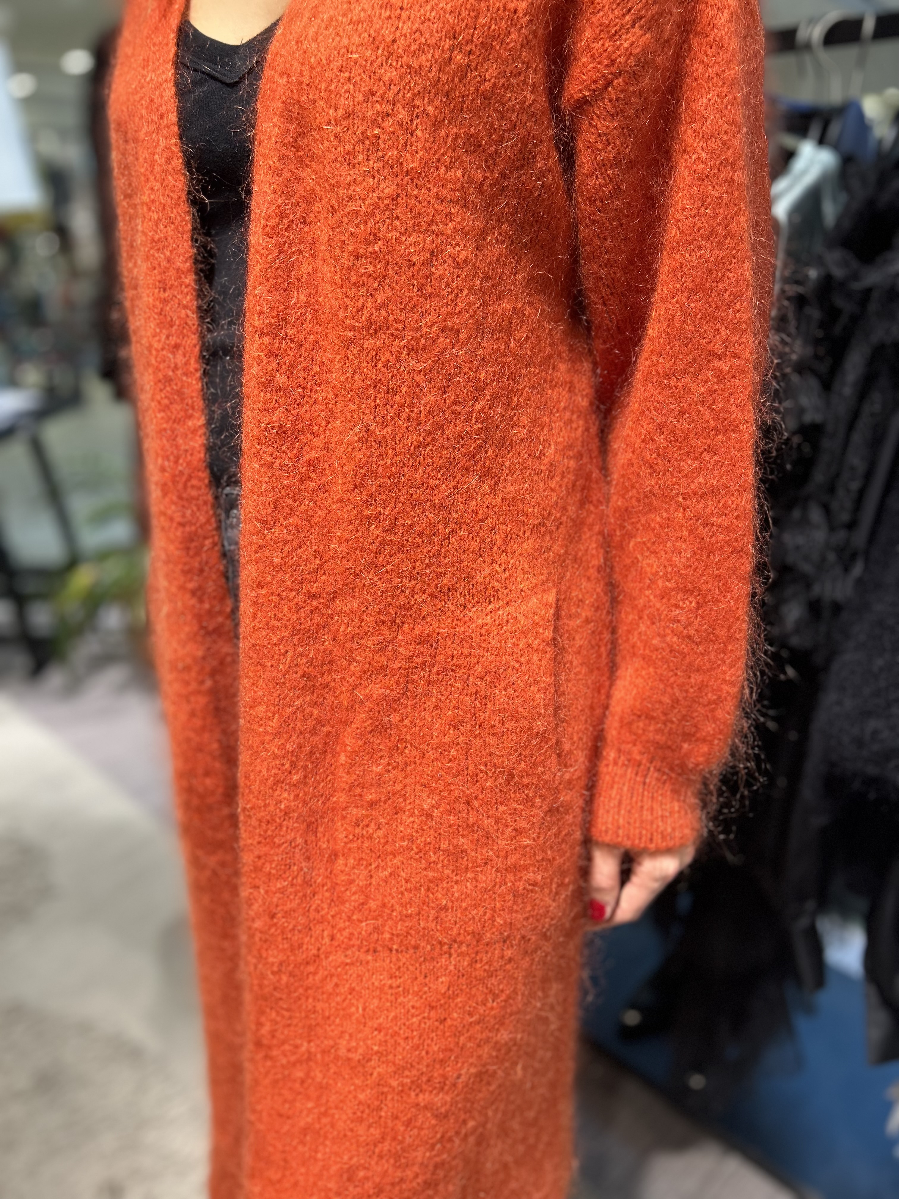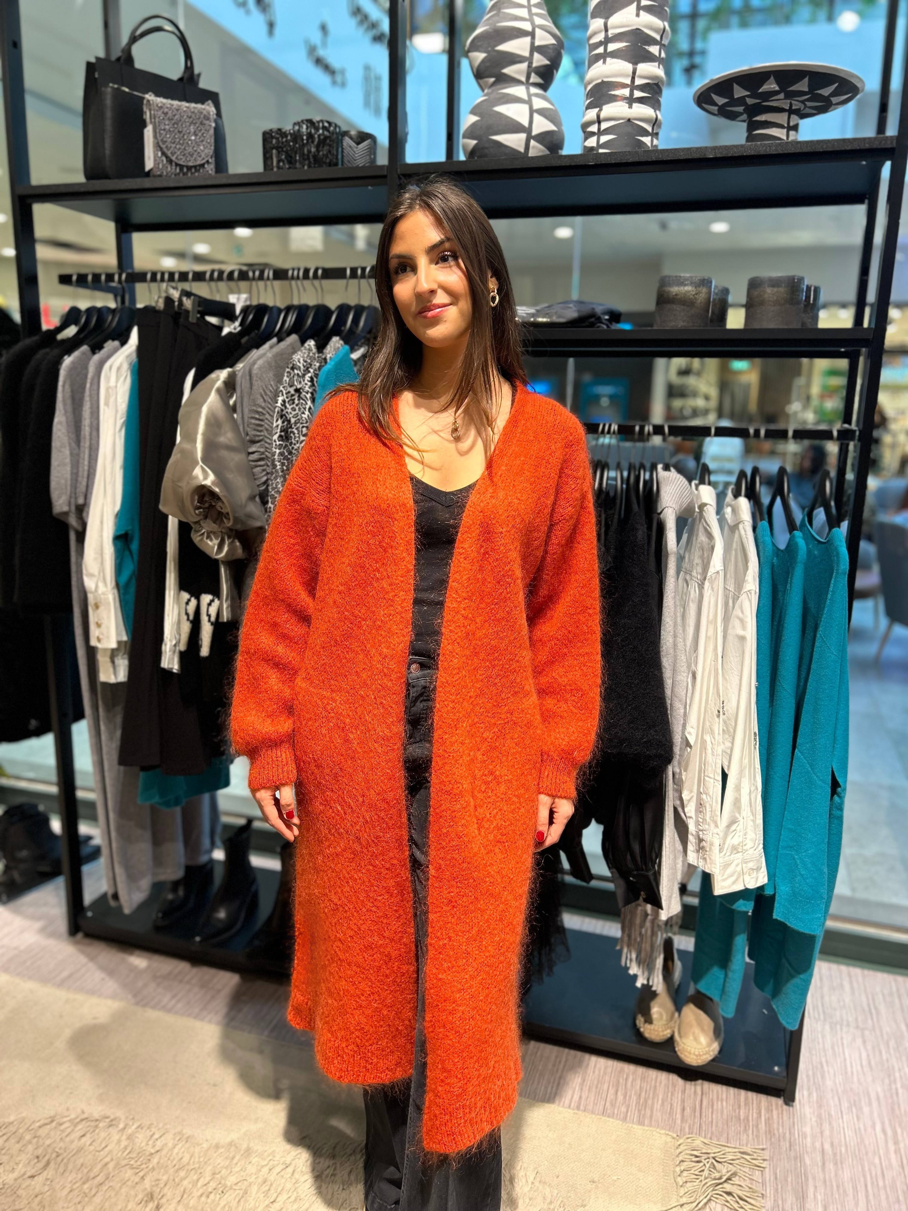 Denna långkofta i en livfull orange nyans är ett perfekt plagg för att tillföra både färg och stil till din garderob. Tillverkad i ett mjukt och värmande material, ger koftan både komfort och en modern, avslappnad look. Den långa designen skapar en smickrande siluett och gör den lätt att bära över dina favoritoutfits. Denna långkofta är ett mångsidigt plagg som enkelt kan stylas över en klänning eller med jeans och en t-shirt för en chic och färgstark look.