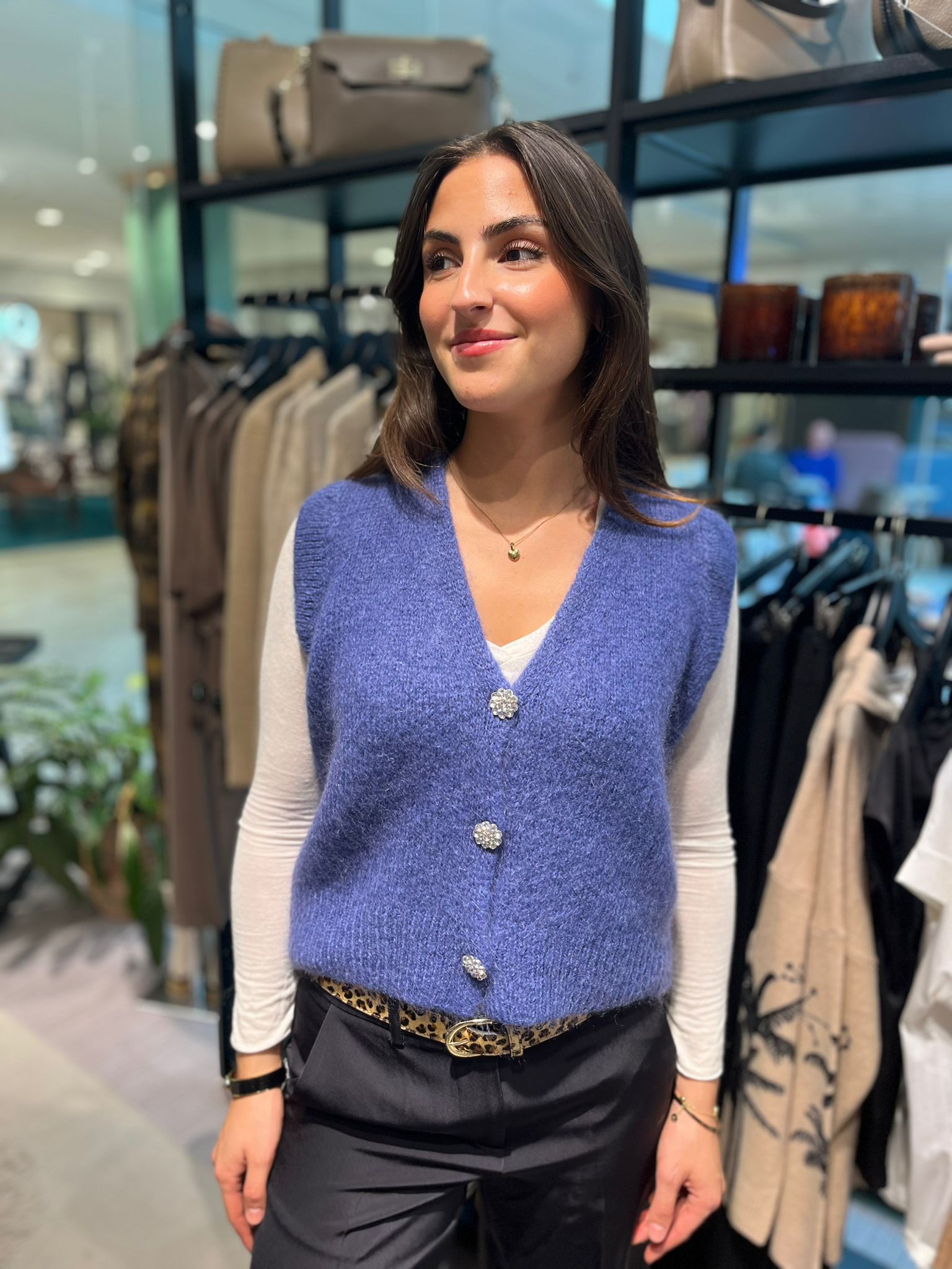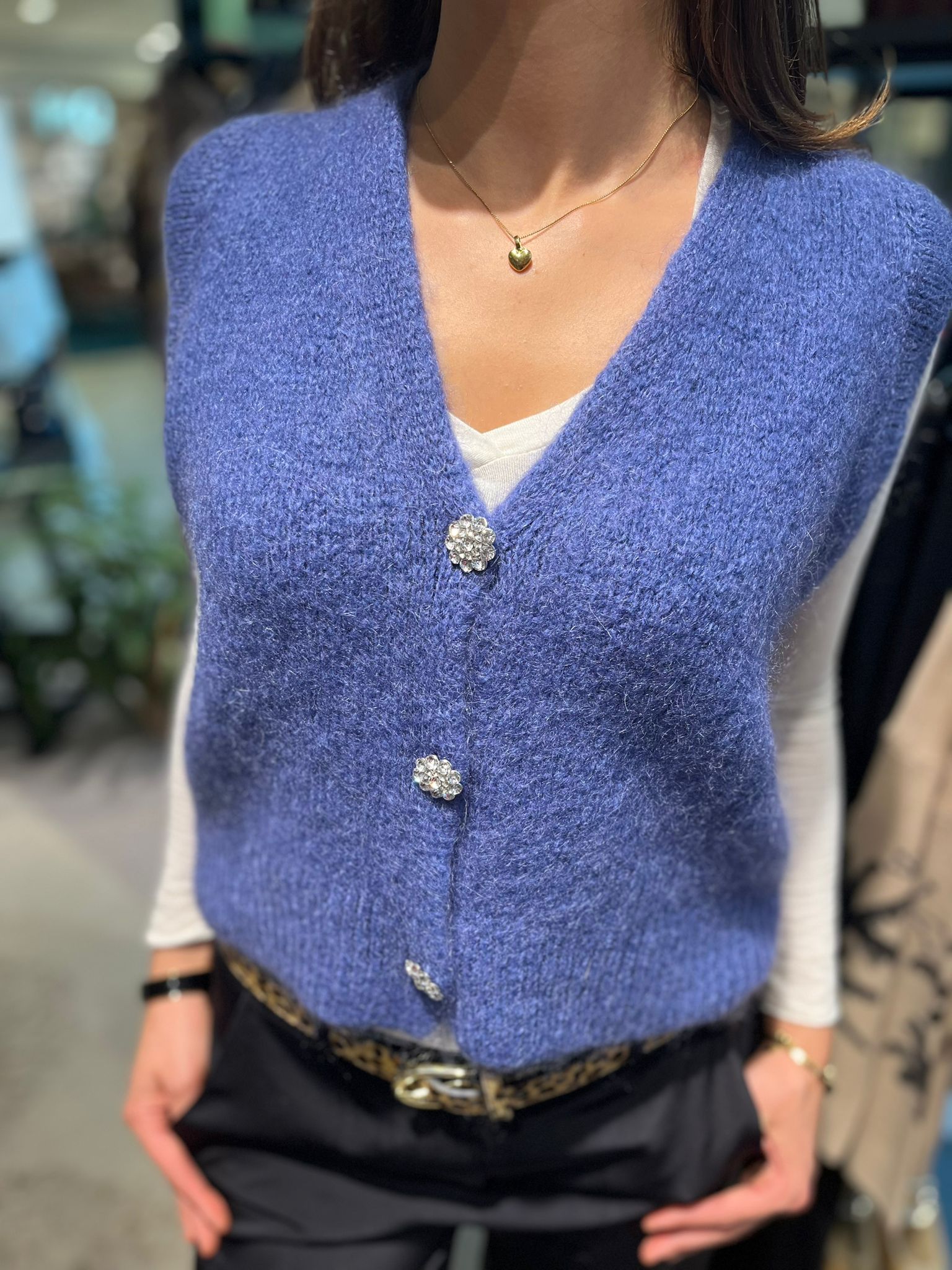 Gina är den ultimata västen för alla tillfällen, perfekt att bära över en skjorta eller under en kavaj. Den tidlösa designen gör att den passar lika bra till vardags som på jobbet eller vid festliga tillfällen. Tillverkad i en lyxig blandning av mohair, ull, polyamid och akryl, ger Gina både värme och komfort utan att kompromissa med stilen. Gina är ett mångsidigt plagg som adderar ett sofistikerat lager till din outfit, samtidigt som den är skön att bära oavsett tillfälle.