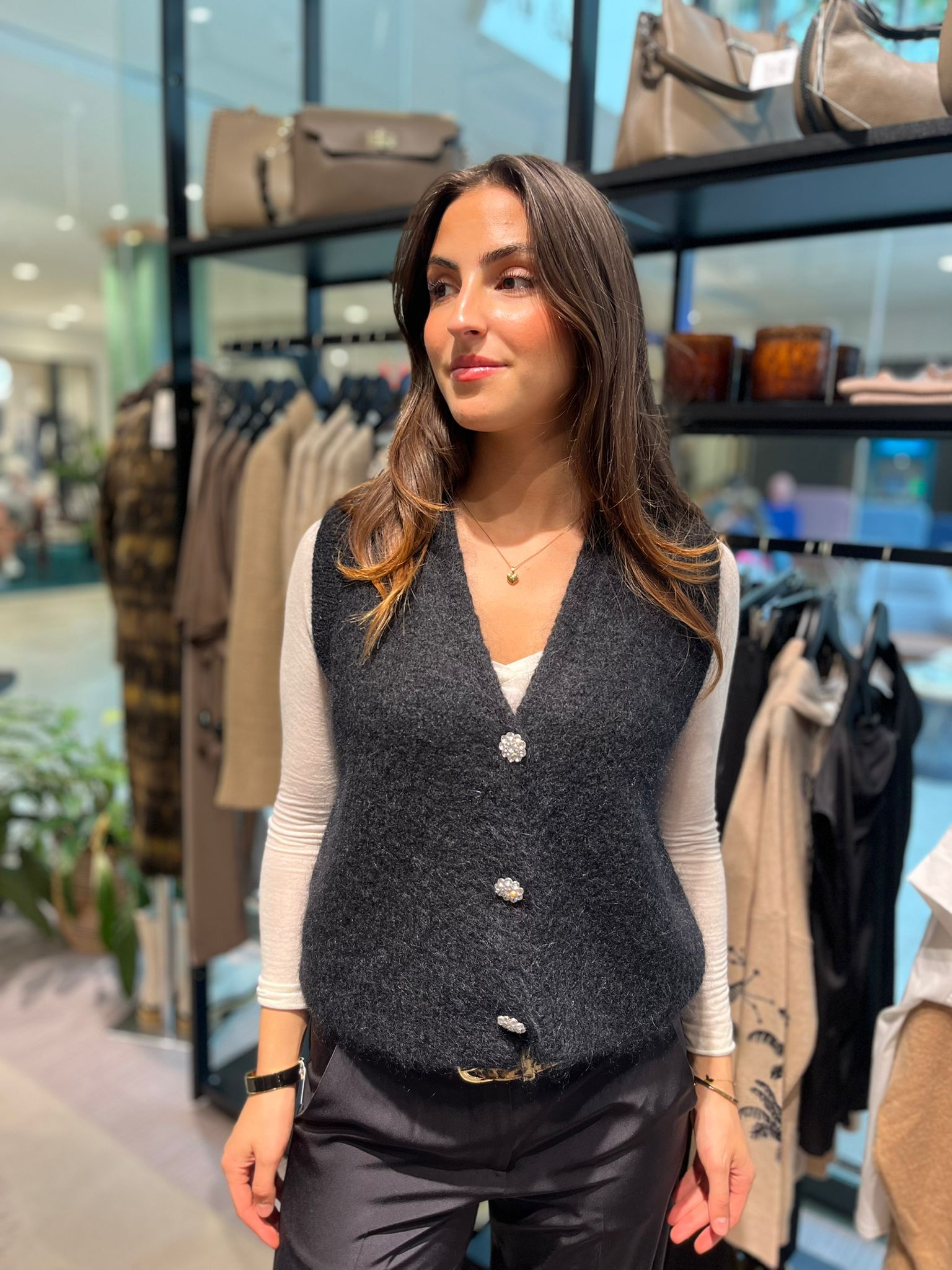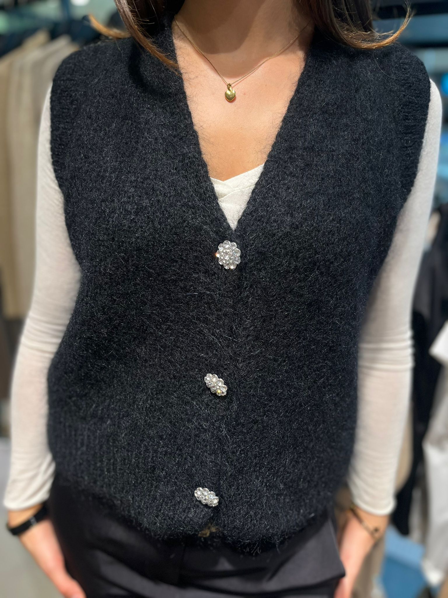 Gina är den ultimata västen för alla tillfällen, perfekt att bära över en skjorta eller under en kavaj. Den tidlösa designen gör att den passar lika bra till vardags som på jobbet eller vid festliga tillfällen. Tillverkad i en lyxig blandning av mohair, ull, polyamid och akryl, ger Gina både värme och komfort utan att kompromissa med stilen. Gina är ett mångsidigt plagg som adderar ett sofistikerat lager till din outfit, samtidigt som den är skön att bära oavsett tillfälle.